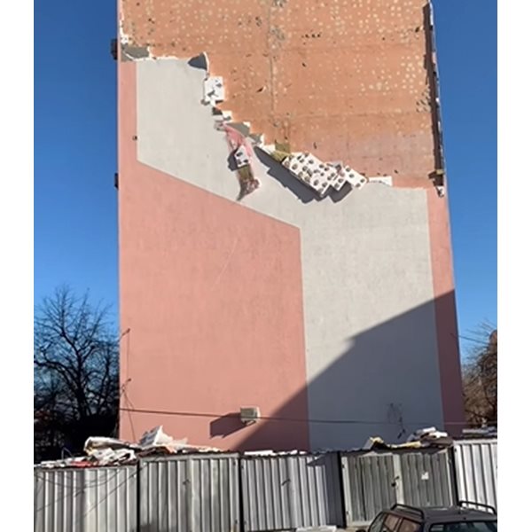 „Монтаж на топки, нито един лист стиропор не е сложен на рамка, освен това се вижда, че и други процедури липсват. Дюбели и грунд на стената, на която е залепен стиропора липсват. Некадърници“, коментира Явор Николов.